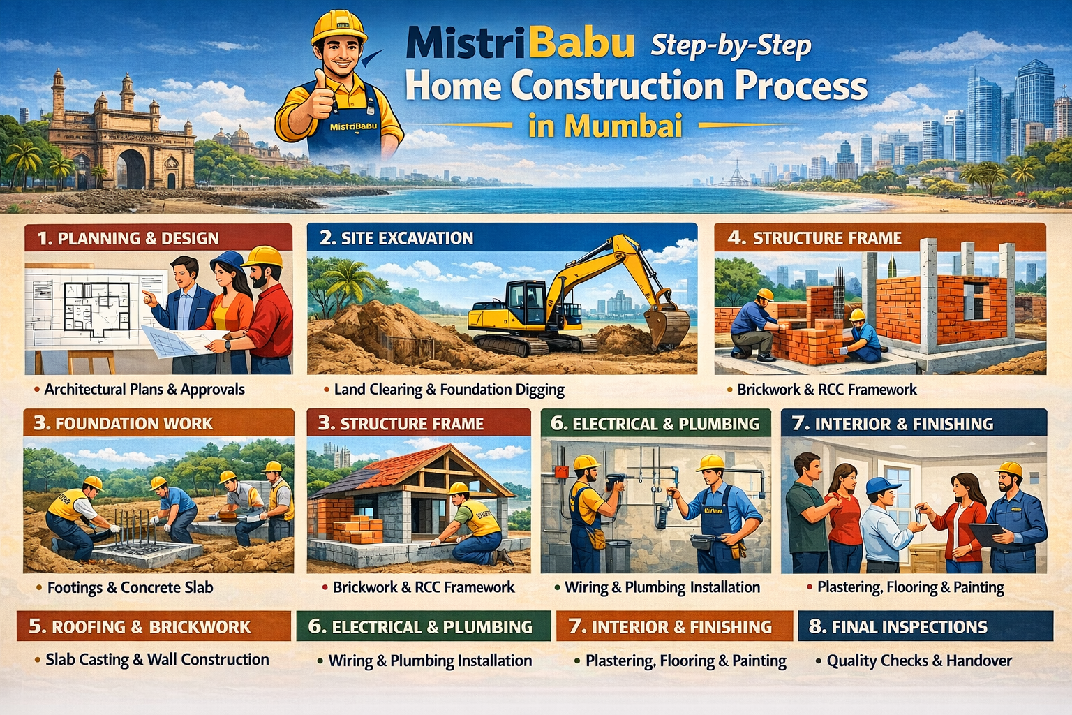 Constructing a home in Mumbai requires detailed planning, strict legal compliance, strong structural design, and proper waterproofing. Following a step-by-step construction process ensures quality, durability, and long-term safety.